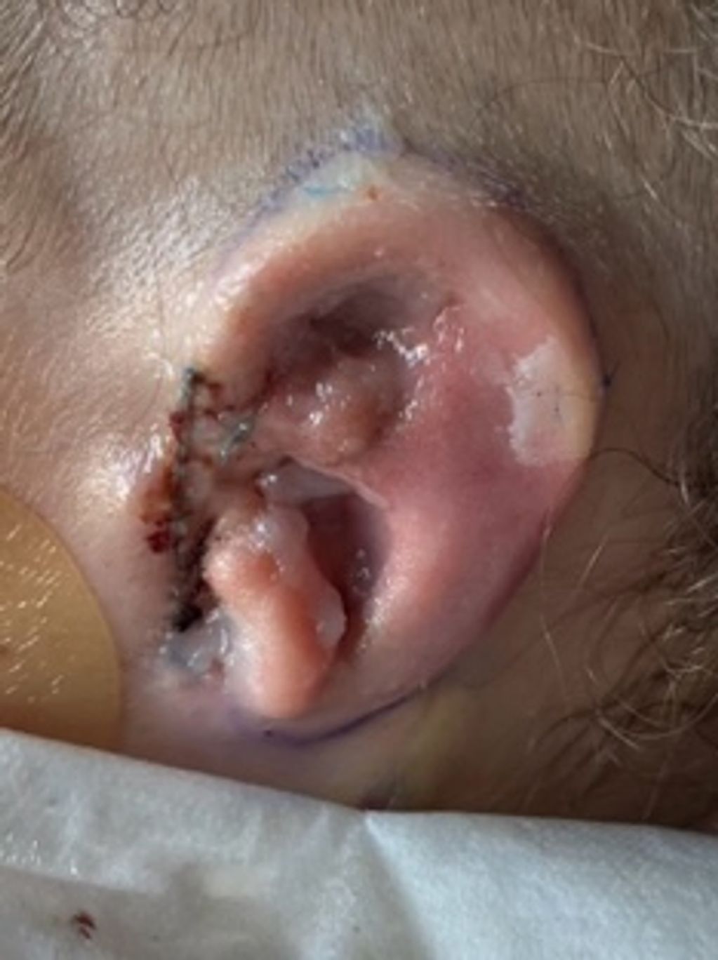 This is day 4 and we were seeing continued swelling - all of which is normal. Dr. Bonilla kept stressing that as long as the ear is pink, it is healthy. Cleaning of leads, blood bags, and around the clock care was continually done. Her baby ear is more evident in this picture, which will become her lobe in surgery #2. The rectangular white piece on the right-middle part of her ear is simply a