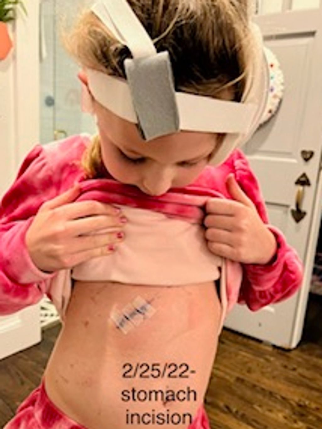 Cate had her stomach covered with a piece of gauze & tape for 11 days, and Dr. Bonilla instructed us to wait for it to come off on it's own. We did so, but I was super anxious to actually see the incision. It's just under 2 inches, and when I think that her rib cartilage was used to build her ear, it still amazes me! Cate has never has any soreness or tenderness at her cartilage retrieval site.