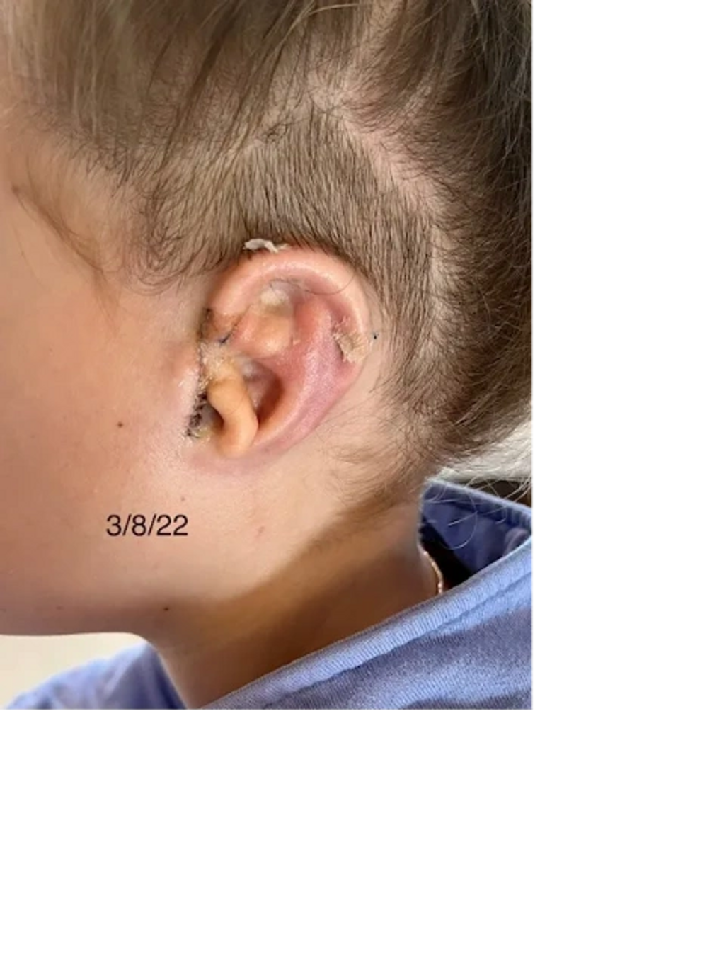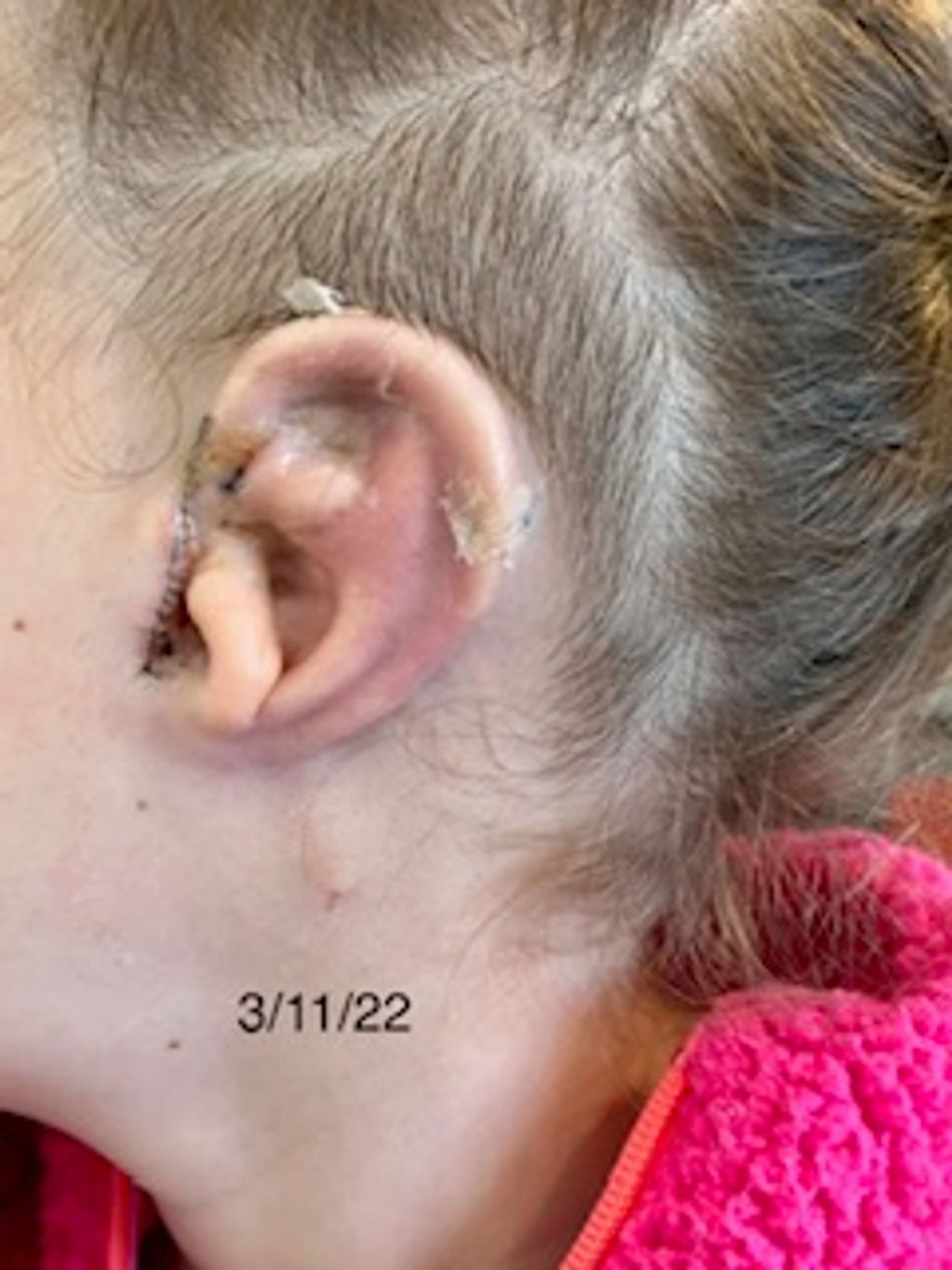 Here we are a week post op! We "aired" her ear out as much as possible. We kept her hair up, and did our 2-3x daily application of hydrogen peroxide & aquaphor. We took excellent care of it.