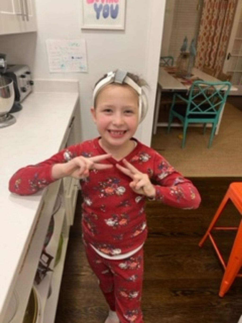This is two weeks after her surgery. She wore her ear cup at school & for any type of activity when she was around people & could be jostled. While at school, Cate had an amazing teacher that allowed Cate to take off her ear cup during seat work to get fresh air. Furthermore, her nurse was so sweet and did an ear check every day at lunch and let Cate and her buddies hangout in the nurse's offic